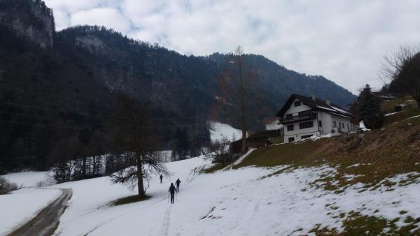 Die milden Temperaturen lassen den Schnee im unteren Bereich schnell dahinschwinden. Von unten bis oben war der Schnee durchfeuchtet und schwer. Die geschlossene Wolkendecke zeigte am Montlinger Schwamm bereits Lücken und auf dem Gipfel hatten wir ein herrliches Sonnenfenster. Der unangenehme Wind am Gipfel war Vorbote der anrückenden Störung.