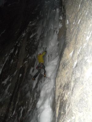 Der Fall ist auf etwa 120 Meter ziemlich konstant 90°, mit mehreren kurzen überhängenden Stellen. Geschätzte Schwierigkeit etwa Wi6+. Die Abschluss-Säule ist leider abgebrochen.