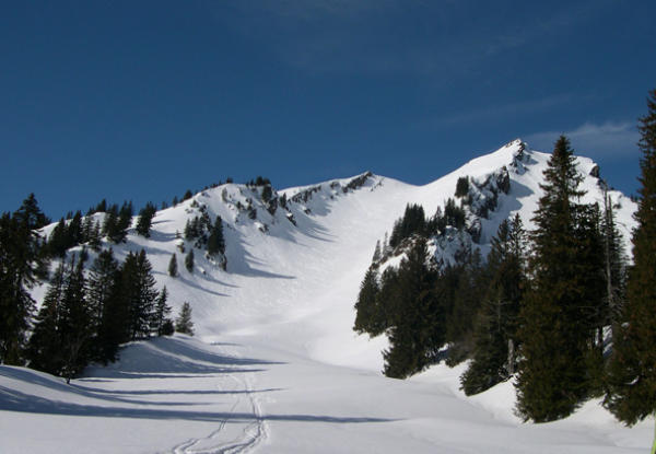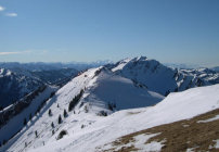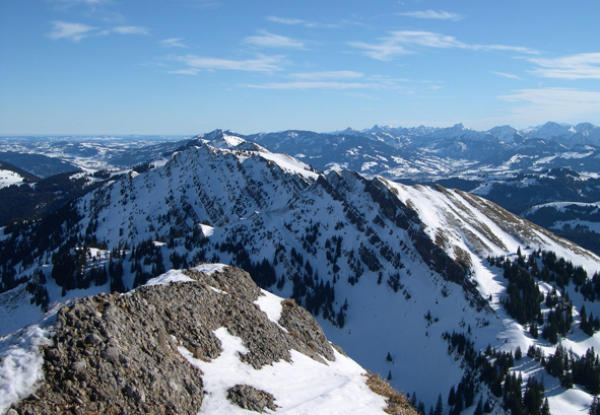 Nagelfluhkette Vom Staufner Haus (1640) über Hochgrat (1834), Güntlehütte, Rindalphorn (1821), Güntlescharte, Güntlekopf (1748) zur Güntlealpe. Unterhalb vom Buralpkopf (ca. 1670) zur Gatteralpe (1489), dann Sedererstuiben (1737) und Stuiben (1748). Abfahrt zur Gund-Alpe. Am nächsten Tag über Punkt 1669 zur hinteren Krummbachalpe und zum Steineberg (1683). Über Bärenkopf (1476) und Mittag (1451) ins Skigebiet von Immenstadt. Abfahrt über Schattenberg (Mittelstation rechts runter) nach Immenstadt.