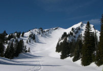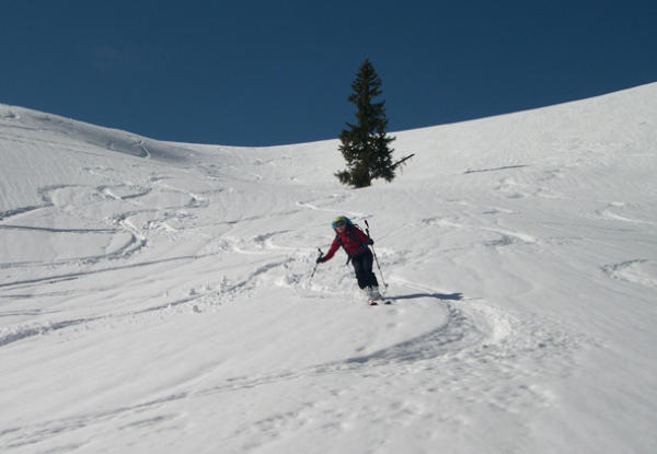 Wunderbares Wetter und gute Sicht für eine Traumtour! Nasse, durchfeuchtete Schneedecke aber gut zu fahren. Ständiger Wechsel von Aufstieg und Abfahrt ist irgendwann lästig: die Felle tropfen regelrecht!