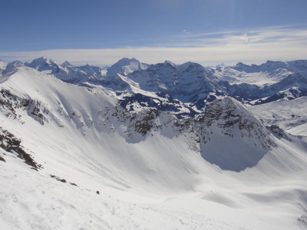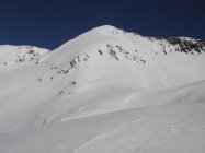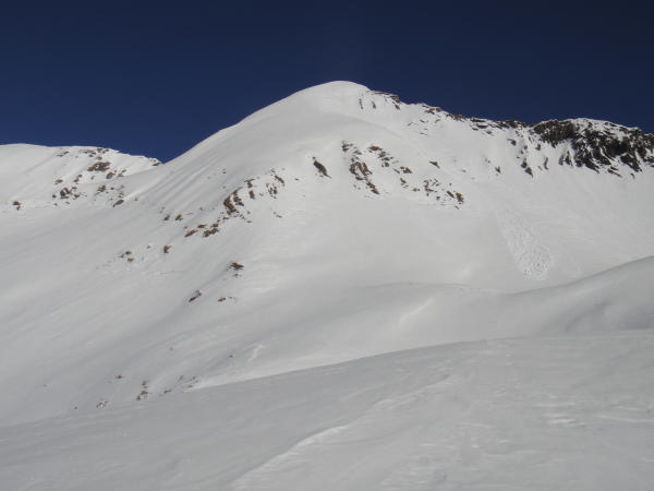 Es wären eigentlich gute Verhältnisse gewesen für die Abfahrt über die SW-Flanke, aber mein Vertrauen in die Dynafitbindung im entscheidenden Moment noch nicht genügend ausgereift. Der Gipfelhang war erst wenig angesulzt.