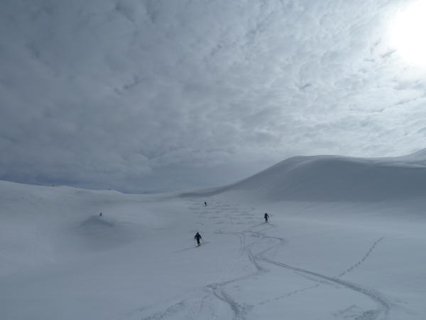 Absolut traumhafte Schneeverhältnisse: Praktisch durchgehend unverspurter Pulverschnee in den fast unendlich vielen tollen Skihängen in dieser 1800 Meter-Abfahrt. Erst ca. 100 m oberhalb Obstalden musste man bei der Routenwahl einige Grasflecken (und die schneefreie Strasse) berücksichtigen! Wetter: nach klarer Nacht am Morgen schön, ab Mittag zunehmend Schleierwolken.