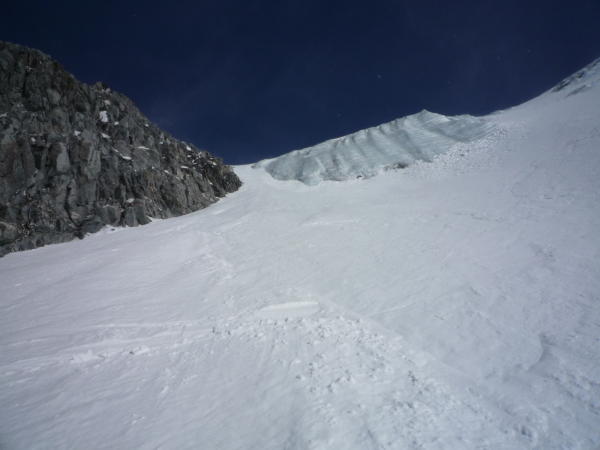 Sehr gute Verhältnisse auf der Glacier Pendant-Route: Im oberen Teil pulvrig, im breiteren SW-Couloir angefeuchteter Pulver (Der Wind treibt den Pulver vom Hängegletscher das Couloir runter, sehr praktisch), dann Sulz. Im unteren engen SW-Couloir Sulz, die Abfahrt von 2800m runter war um die Uhrzeit (16 Uhr) nicht so toll, geht aber dank Fussweg ab 2100m gut).