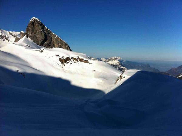 Bei der Abfahrt ins Muotathal (11:00 Uhr) im oberen Bereich in den Nordexpositionen noch herrliche Pulverhänge, immer wieder auch tragende Harschbereiche. Ab 1500 wird der Abfahrtspass schnell weniger, aber bis nach Muotathal noch genügend Schnee und fahrbar.