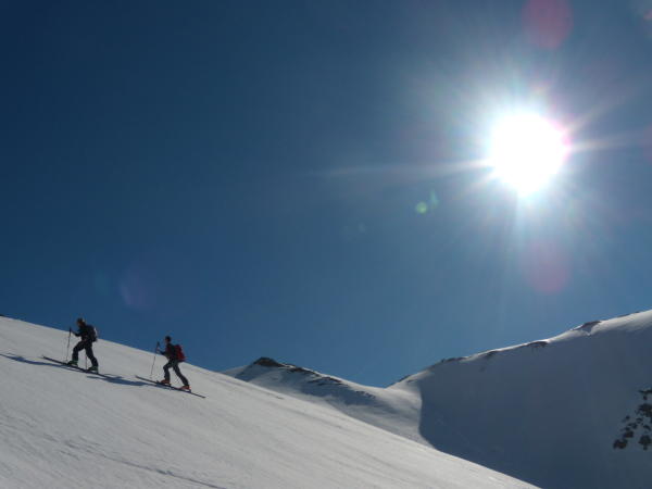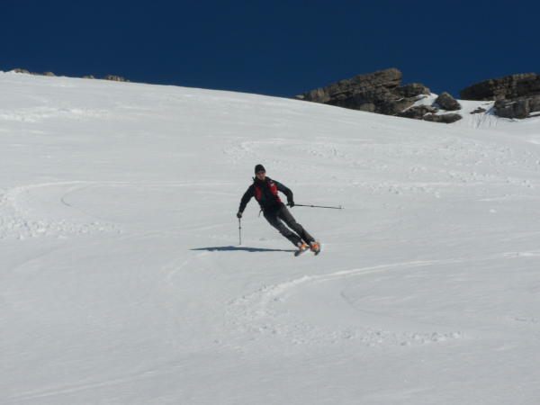 Sehr guter Firn im oberem Hang. Abfahrt um 12 Uhr. Weiter unten etwas tief/schwer, aber noch gut zum fahren.