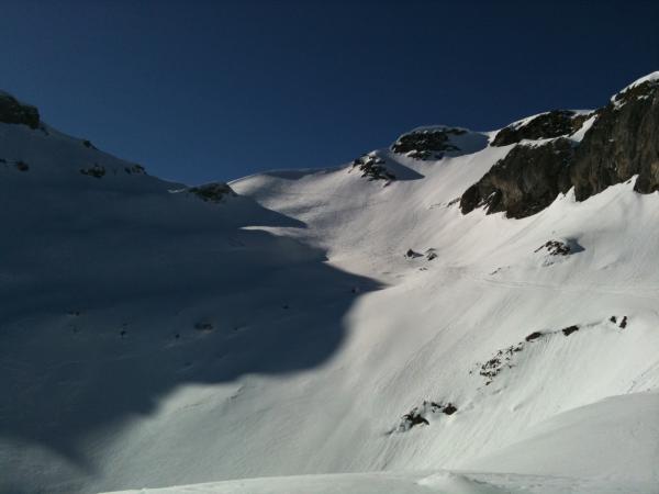 Abfahrt unterhalb des Sattels Pt. 2685 rechtshaltend noch Pulver gefunden. Richtung Traverse unterhalb Wärmuetflueh weich, Hohtürlihang oben wieder Pulver leicht gedeckelt, weiter unten Richtung obere Bundalp sulzig, zum teil schon recht tief.