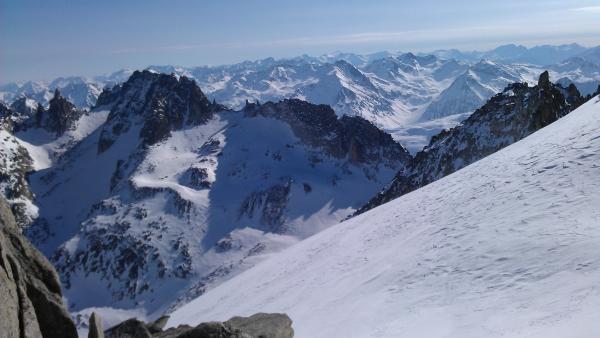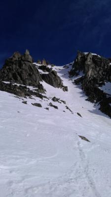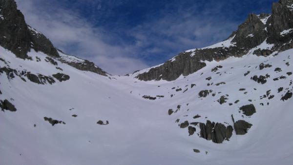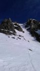 Harsteisen nach der Winterlücke montiert. Das Gipfel-Couloir war ziemlich hart- mit Steigeisen gut machbar. Der Grat links vom Couloir ist abgesehen vom oberen Teil praktisch schneefrei.