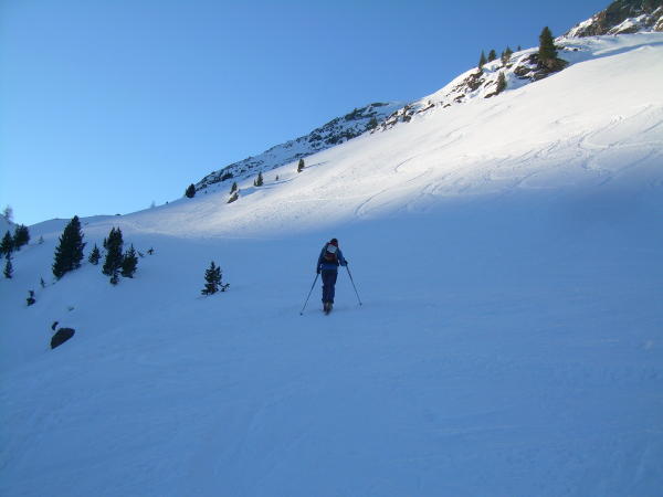 Traumwetter, mit angenehmen Frühjahrstemperaturen. Über Nacht hat Abstrahlung stattgefunden, die Hänge waren sowohl im morgendlichen Aufstieg ab 7.45 h, als auch im Abstieg zwischen 11 und 12 Uhr, sicher. Schneedecke im Abstieg angenehm aufgefirnt, was auch mit Schneeschuhen vorteilhaft war. Die Hänge sind schon recht zerfahren.
