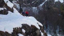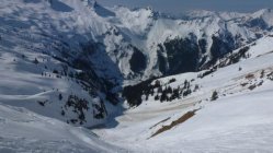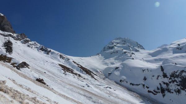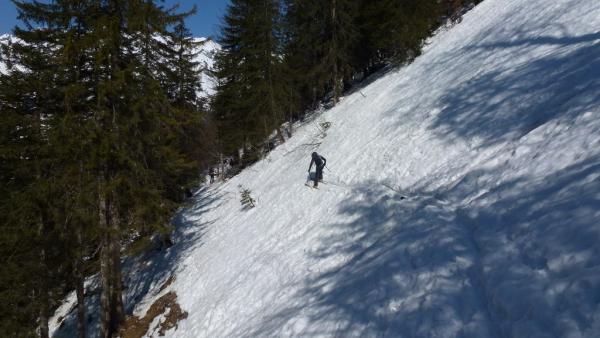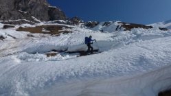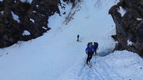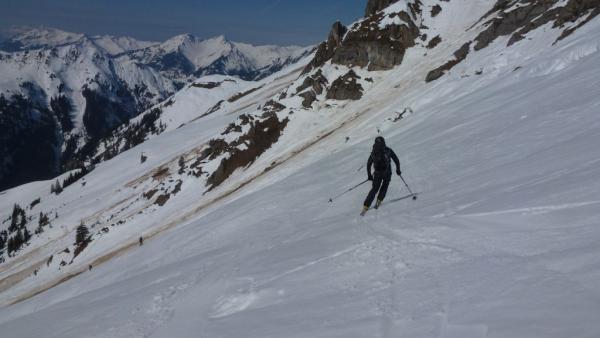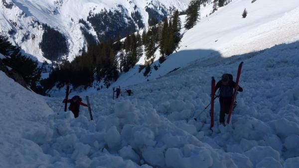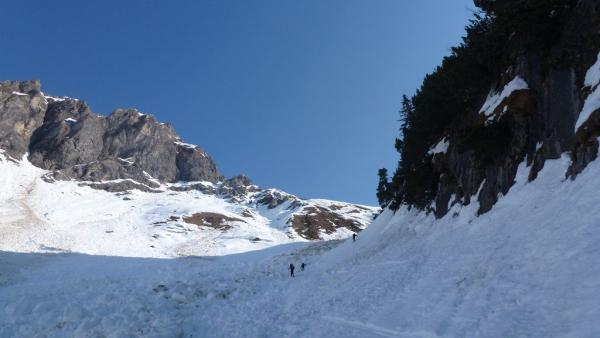 Bei der Tourenplanung haben wir nicht damit gerechnet, dass die Schneeverhältnisse so schlecht sind. Der Taleinschnitt unter dem Mutterwangjoch war großflächig mit Gleitschneelawinen gefüllt. Mangelns anderer Möglichkeiten musste durch die Lawinenzonen zu Fuß durchstapft werden. Da alles auf dem Nomalanstieg zugeschüttet war, versuchten wir links über die steilen Flanken und Rinnen zum Mutterwangjoch zu gelangen. Die Querung oben über die schon länger sonnenbeschienen, südausgerichteten, steile Flanke war uns viel zu unsicher (die mächtige Schneedecke war durch und durch weich). Wir haben die Tour daher noch unter dem Mutterwangjoch abgebrochen. Ein Anstiegsversuch weiter unten im Bereich der Normalroute verwarfen wir, da wir auch auf einen sicheren Rückzug achten mussten. Die Sonne setze den Schneemassen minütlich zu und wir durften keine Zeit verlieren. Erst bei Bad Rotenbrunnen konnten wir ausgiebig Rast halten und uns stärken.