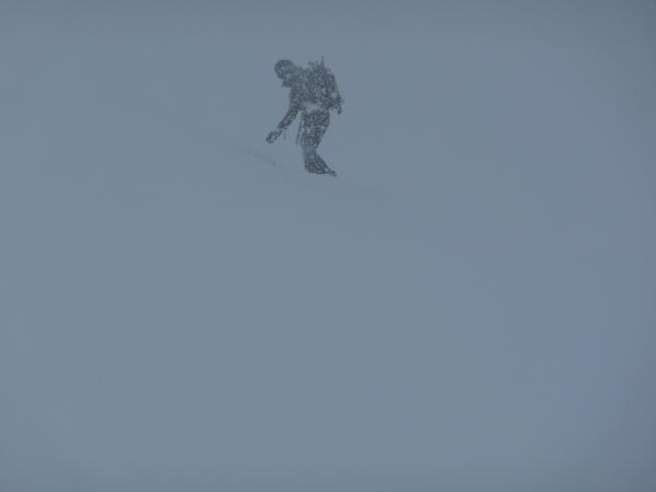 Schnee, Nebel und wenig Wind. Da keine Hoffnung auf Besserung mehr bestand, sind wir kurz vor dem Skidepot umgekehrt. schönster Pulver (10cm) auf tragender Unterlage. Nur in den letzten 100hm vor dem Parkplatz eigebrochen.