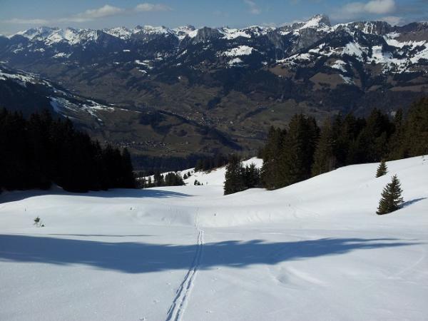 In der Region Diemtigtal resp. am NW-Hang der Niesenkette reicht der Schnee noch etwa bis 1100m. Deshalb Portage bis Luss 1076m. Ab dort hart gefrorene Schneedecke welche auch am Nachmittag nicht taute (!). Daher ideale Verhältnisse! Ab 1700m ein Schüümli Schnee auf einer nach wie vor harten-sehr harten Unterlage. Sonnenabgewandt pulvrig, an den Südhängen schon umgewandelt in ein Sülzli. Einfach traumhaft!! Abfahrt direkt vom Nordgipfel in der WSW-Flanke. Top-Verhältnisse. Hart, griffig, sicher. Heute wäre hier noch viel mehr möglich gewesen bei entsprechendem Mut. Z.B. Direktabfahrt vom Südgipfel da im Drunenkessel noch nicht fast nichts abgerutscht ist.