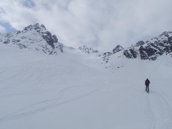Im Aufstieg meist harte Unterlage. Bei der Abfahrt bis ca. 2300 m pulvrig, danach bester Firn bis 1500 m. Im untersten Teil durchfeuchtet.