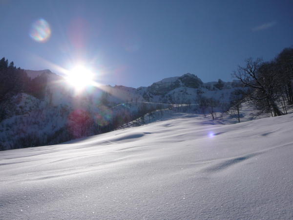 25cm lockerer Pulverschnee auf harter Unterlage, erst im Gipfelhang von der Sonne schon ein wenig zusammengesetzt