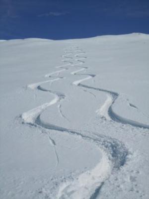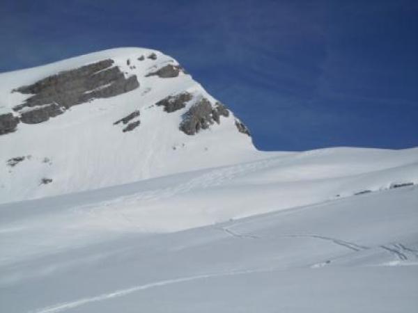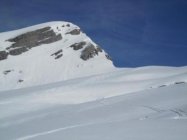 Gipfel zu Fuss. Vom Skidepot links um den Felskopf hoch, da es rechtsrum grosse Wächten hat.
