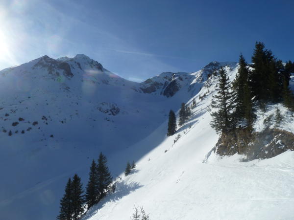 Abfahrt zum Mittliste Morgete im oberen Teil noch Pulver. Ab ca. 1700m aufgeweicht.
