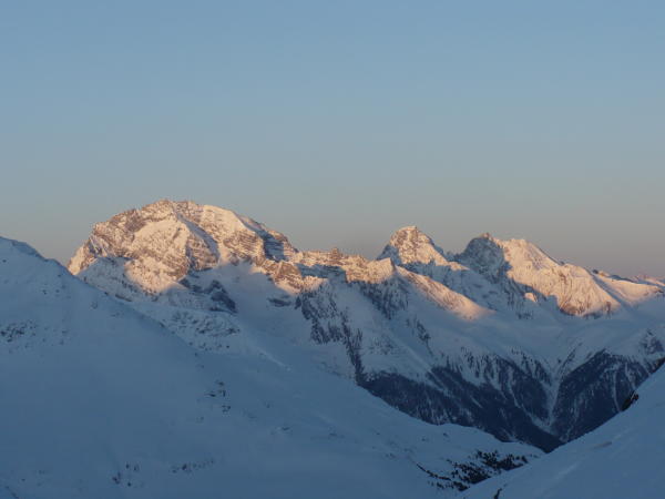 Im Süden bei Sonne sulzig. Im Norden bei früher Abfahrt pulvrig. Der Gipfelgrat braucht noch etwas Zeit für besten Trittschnee.