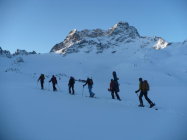 Sonntag Aufstieg bis zum Skidepot bestens. Pünklich mit Erreichen des Skidepot zog der Gipfel zu und die Sicht betrug dann nur noch max. 20 Meter. Nur 2 Personen aus der Gruppe haben den Gipfel erreicht. Die anderen sind kurz vorher umgekehrt. Es hat sehr starken Wind gehabt und eine Menge Triebschnee. Von feinem Trittschnee war heute nur zu träumen. Eine heikle Platte kurz vor dem Gipfel bewog die meisten Leute (auch anderer Gruppen) zur Umkehr. Nur loser Schnee drauf und keine Sicherungsmöglichkeiten.