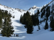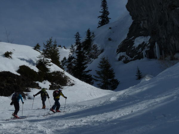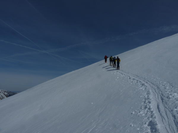 Unmittelbar nach Les Troncs im Aufstieg zu Plattuy harter Schnee, wo Harscheisen angebracht sind (weichte sich nach Mittag etwas auf). Weiter oben meist windgepresster Schnee, jedoch recht gut fahrbar. Eindrückliche Rundsicht.