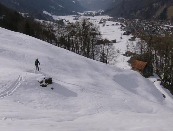 Wenn es wärmer wird nicht mehr ganz durchgehen bis ins Muotatal Schnee. Mit etwas Skitragen noch eine Weile machbar.