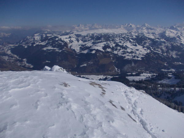 Trotz der geringen Höhe bietet sich ein grandioses Panorama. Vom Schreckhorn, mit Eiger, Mönch und Jungfrau... Weisshorn, Matterhorn, Dent-Blanche bis zum Mont-Blanc liegen die Alpen ausgebreitet vor dem Auge.