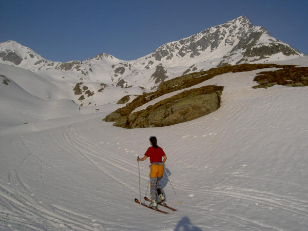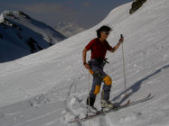 Wunderbarer Sulz. Neuschnee ist mit der unteren Schicht gut gebunden. Das steile Gratstück oberhalb des Sattels ist immer noch recht gut schneebedeckt. Ein geschenkter Tag...