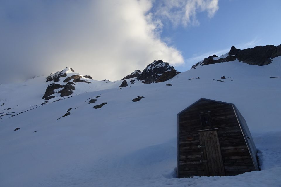 Die Verhältnisse ab 2600m sind weiterhin sehr gut. Es liegt genug Schnee, welcher heute hart und trotzdem griffig war. Die wenigen offenen Spalten sind gut sichtbar. Den Fussaufstieg zum Gipfel musste ich neu anspuren, ohne Pickel und v.a. Steigeisen wäre das nicht zu verantworten gewesen. Ich habe die Ski bis zum Gipfel hochgenommen. Das lohnt sich, nicht skifahrerisch wohlgemerkt (beinhart), aber zeitlich ;-)