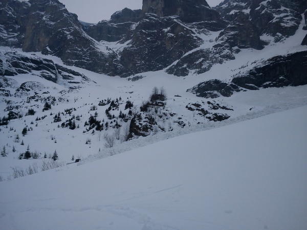 Von den Osthängen der Rimistöck donnerte gegen 08.30 eine riesige Lawine runter. Sie verschüttete die Aufstiegsspur auf über hundert Meter. Durch Glück wurde niemand verschüttet. Es liegt noch viel Schnee in den Felspartien der Rimistöck, der in nächster Zeit runter kommen wird. Darum die Empfehlung: Von Punkt 1523 nach dem Steinhüttli Höhe halten und links (östlich) ausholen, um so auf die Rippe zu gelangen. Wer die Ausmasse dieser Lawine aus der Nähe betrachtet, wird bei künftigen Frühjahrstouren so zum Uri-Rotstock und Brunnistock steigen.