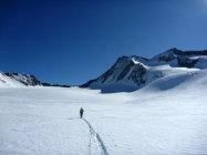 Insgesamt recht wenig Schnee im Gebiet. Auf dem Gletscher ständiger Wechsel zwischen Bruchharsch und brauchbarem Pulver.