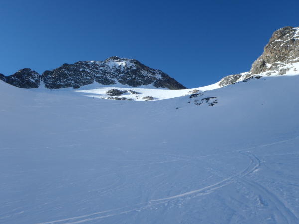 sehr gut gesetzte Schneeverhältnisse. Abfahrt von Tschima da Flix nach Bivio aufgrund Bruchharschschnee momentan nicht empfehlenswert! Genau so die Abfahrt: Scharte Calderas Richtung Sur Eis und Bruchhharsch