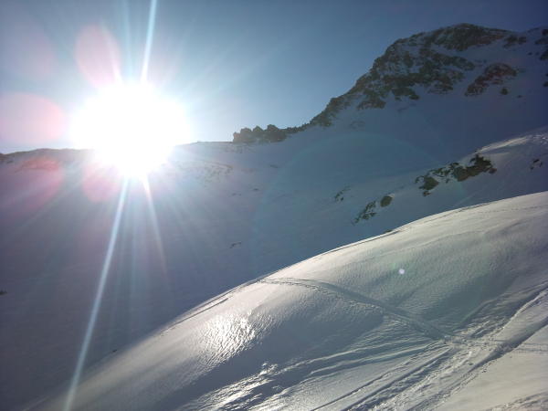 Gegen 9.30 Uhr hats aufgefirnt....Abfahrt über den Südhang Richtung Vilsalpsee mit traumhaften Firnverhältnissen...Nordseitig sehr verfahren...unterhalb des Steilstücks auch Firn.