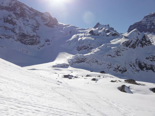 Rücken und Querung bis Glattfirn: Stabile Verhältnisse. Schnee wechselt von hart über leicht gedeckelt bis zu Pulver in den Rinnen und Sulz an den Sonnenflächen. Bei den anhaltenden Föhn-Bedingungen wird dauernd Pulverschnee (Triebschnee) aus Süden eingeblasen. Steilere Hänge unterhalb des Krönten sind eher zu meiden.