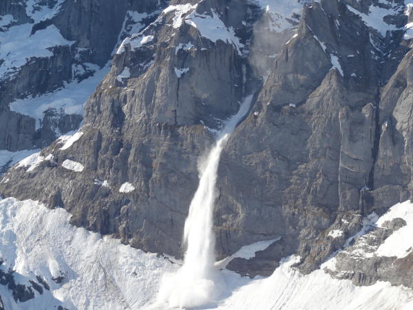 Von frühmorgens bis spätabends Rutsche und auch grössere Lawinen auf der gegenüberliegenden Talseite Schlossberg / Sunnig Stöck.