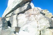 Couloir zwischen Türmlihore und Landvogtehore noch guter Pulver, schön zu fahren. Ab Sattel ca. 100 Hm Schmelzharschdeckel, nordwestliche Hangseite bis zur Einkerbung Landvogtehore/Gsür wieder guter Pulver. Mit Skier bis zum Beginn der Gipfelfelsen des Gsür, Schlüsselstelle kurz vor Gipfel mit Bandschlinge zum "Zurückpendeln" ggf. zusatzlich mit Seil sichern. Steigeisen + Pickel in jedem Fall hilfreich.