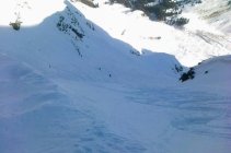 In dem Couloir gibt es keine Sonne - nach dem WoEnde wohl übel zerfahren, heute war noch genug Platz für neue Spuren!