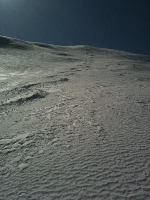 Gute Aufstiegsspur. Ab der oberen Bundalp zum Teil etwas mehlig aber problemlos ohne Harscheisen machbar.