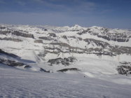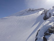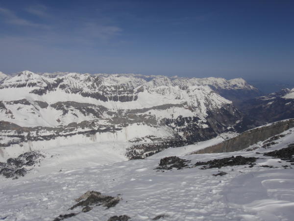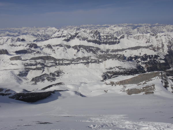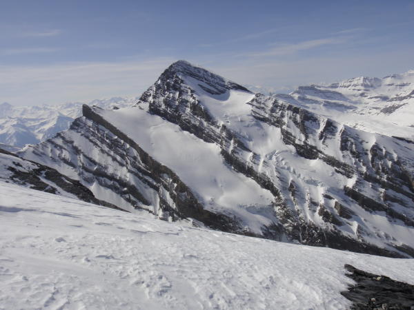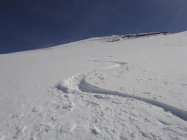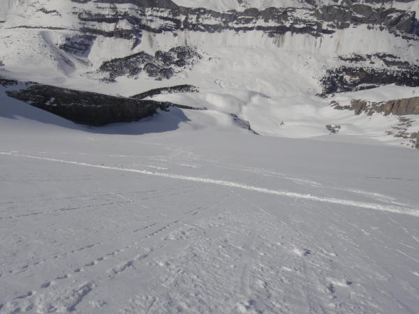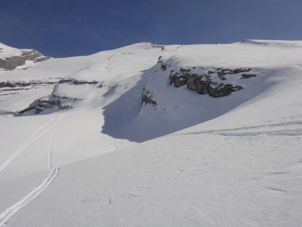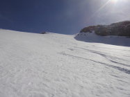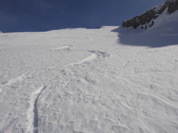 Der Gipfelanstieg aus der Mitte des Gipfelaufbaus wurde gemacht (sogar in der Abfahrt!), aber es liegt lockerer Pulverschnee auf den abwärtsgeschichteten Platten, teilweise haltlose Verhältnisse, was mir nicht so behagt hat.