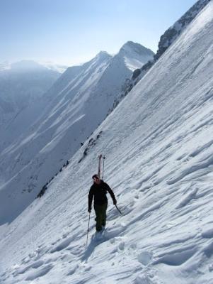 schnee überraschend windgeprägt. frischer pulverschnee nur im oberen viertel der flanke. die felsstufe oberhalb des haussockeggs noch leidlich schneebedeckt. unterhalb 2100m feiner sulzschnee.