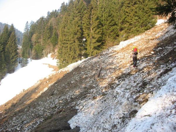 Schnee erst ab ca. 1100m bis 1400m aber reichlich Lawinenrunsen zu queren. Hier muss man schonmal Ski aussziehen und ein Stück tragen. Ab 1400m kann man die Ski bis zum Skidepot druchgehend anlassen. Ab 1400m noch 1,5m Schnee vorhanden.