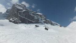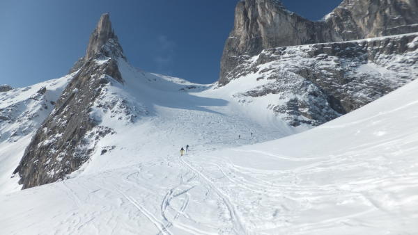 Die Schlüsselstelle kurz vor dem Ausstieg war nur mit Harscheisen oder zu Fuß machbar.
