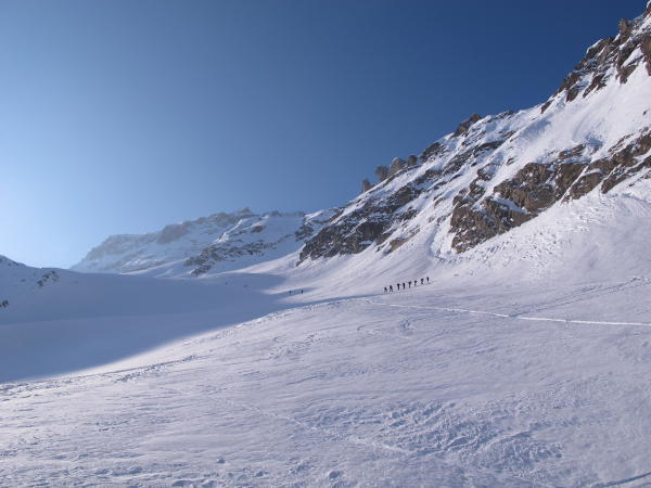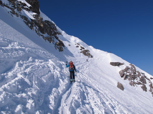 Windharscht und sonstiger Deckelschnee, stark verfahren, in der direkten Abfahrt unterhalb vom Frühstücksplatz Richtung Skipiste auf den Rippen pistenähnliche gute Schneeverhältnisse zum Abfahren gefunden. Frühstücksplatz gut geschaufelt und sicher passierbar