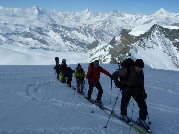 Normalroute von Mittelallalin via Feejoch Vom Mittelallalin auf 3457 m auf der Normalroute zum Feejoch (3826 m) weiter zum Allalinhorn. Die Abfahrt zur Längflue auf 2869 m. Im unteren Teil via alte Skipiste bis zur Sonnenterrasse