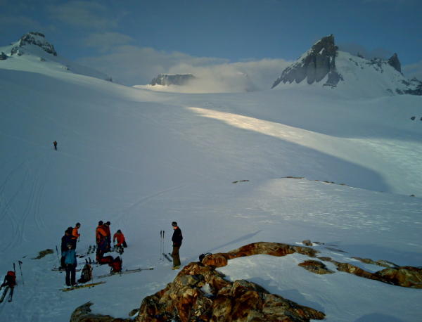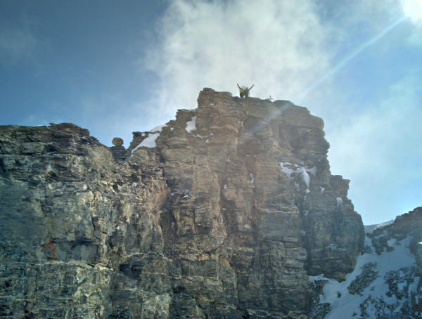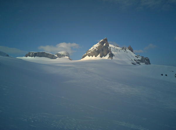 Skis bis 2950 an den Füssen. (Es hatte sogar Spuren bis fast auf den Gipfel.) Perfekte Verhältnisse. Gipfelaufstieg östlich durch ein Schneecouloir (1 Bh).