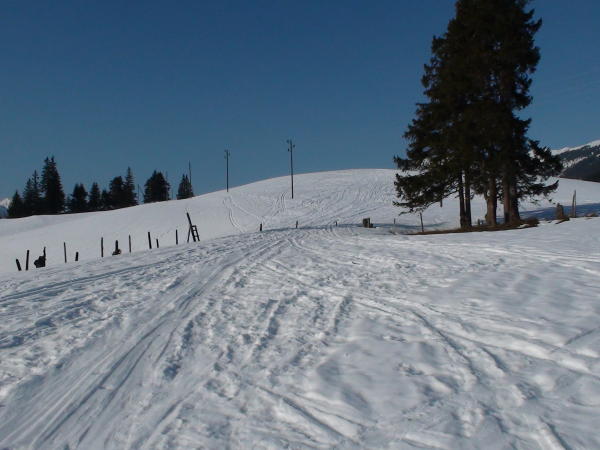 Der unterste Hang, Hirsegg, weisst einige Grünflächen auf. Sonst noch sehr gute Schneeverhältnisse. Gut ist, wenn die Abfahrt um 11.00 Uhr gestartet wird, sonst wird es im unteren Bereich tief.