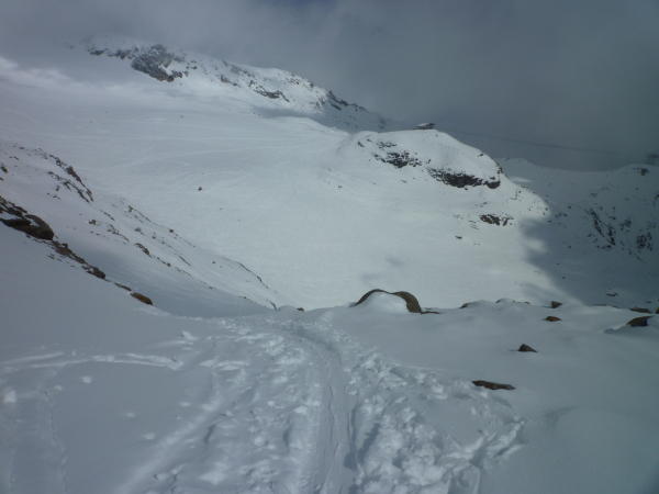 Die Aufstiegsspur wäre deutlich angenehmer zu gehen, wenn nicht irgendwelche merkbefreiten Helden zu Fuss in der Skitourenspur hochgelatscht wären. Den Kratern nach zu urteilen, haben sie wenigstens ordentlich Sport gemacht;-).