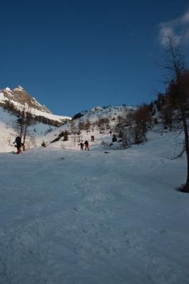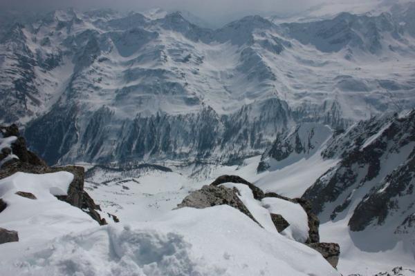 Schon am frühen Morgen warm. Trotzdem mit Harscheisen bis zum Gipfel aufgestiegen.
