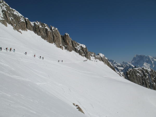 Aufstieg mehrheitlich in leichtem Sulz. Gipfelhang hart. Harsteisen nützlich. Abfahrt ins Val Strem und Wiederaufstieg in den Chrüzlipass und Abfahrt in die Etzlihütte. Sulziger je älter der Tag ist.