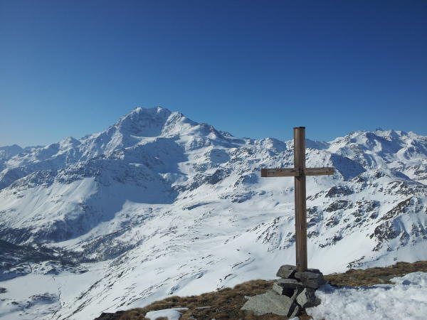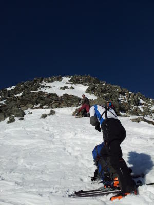 Bis in den Sattel gefrorener Schnee im oberen Teil durch die frühe Sonneneinstrahlung bereits leicht angeweicht. Grat verschneit aber gute Trittspur vorhanden. Abfahrt schöner Sulzschnee.