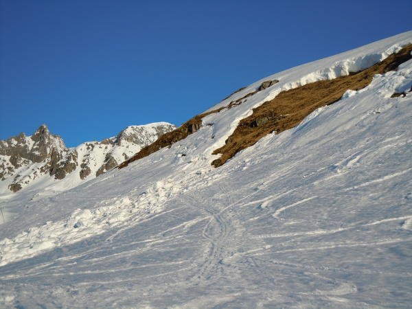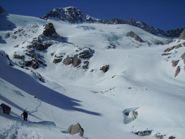 Im Couloir nebst wenigen Blankeisstellen sonst recht guter Trittschnee.