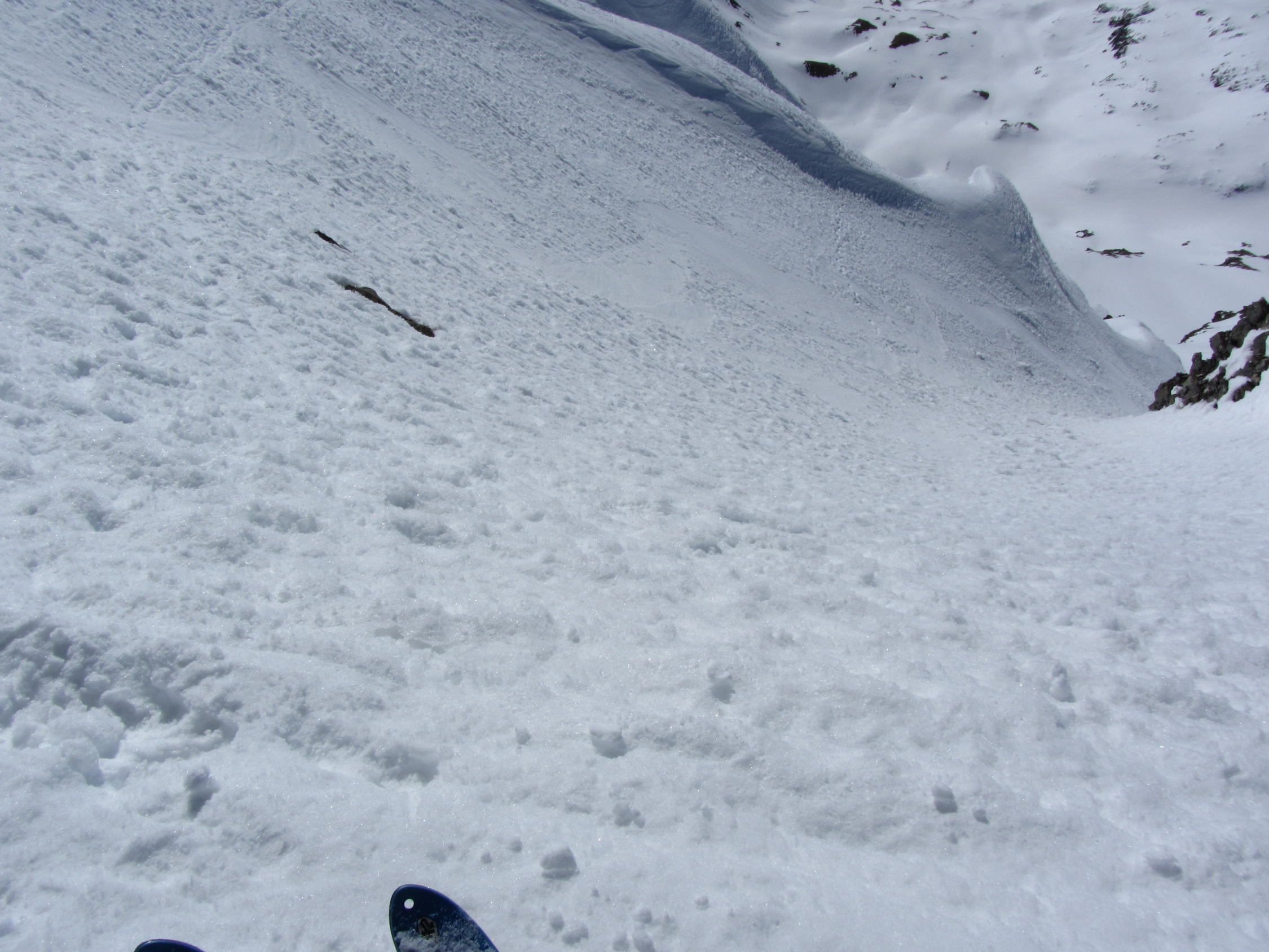 Auf der Abfahrt zu wenig Schnee. Die Saison am Piz Linard ist eigentlich bis zum nächsten Schneefall vorbei, zumindest für die Normalroute. Die Skis müssen aktuell bis 1960m getragen werden, runter gehts dem Hüttenbach bis maximal 1800m um dann weiter unten die Fahrstrasse in der Kurve Höhe 1760m wieder zu gewinnen, auf welcher man noch 100 Hm runter fahren konnte.