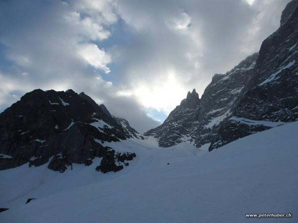 Leider war der Gipfel den ganzen Tag im Nebel. Oberhalb des Passes war alles ganz in Weiss. Genügend Schnee ab dem Start (drei ganz kurze Tragpassagen). Derzeit parkiert man vor der Brücke am Ortsausgang bei P1023. In der Chälen hart gepresster Schnee. Im Aufstieg helfen Harscheisen. Skidepot bei ca. 3060 m. Im Fussaufstieg ohne Steigeisen machbar - gute Verhältnisse, aber für den Abstieg mit Steigeisen doch sinnvoll.